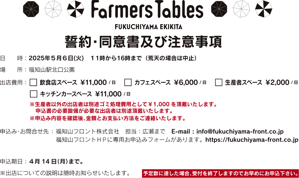 Farmers Tables Spring ※必ず事前に「衛生管理に係る基本事項」をご一読ください。 衛生管理に係る基本事項 ※「出店申込フォーム」からお申し込みができない方はPDFをダウンロードし、ご記入の上ご提出ください。 PDFのダウンロードはこちら ●誓約・同意書及び注意事項 ●出店申込書 出店申込フォーム 入力いただいた個人情報は当社の個人情報保護方針に従って厳重に管理されます。 メールはSSLで暗号化されており、情報を安全にお送りすることができます。 『必須』印のついた項目は入力必須となっておりますので、必ずご入力ください。 自動返信メールが届かない場合、大変お手数ですがご連絡ください。 1)誓約・同意書及び注意事項 私は、次の事項に該当しないこと表明し、かつ将来にわたっても該当しないことを誓約します。 ①暴力団、②暴力団員、③暴力団準構成員、④暴力団関係企業、総会屋、社会運動等標ぼうゴロ、特殊知能暴力団等に所属している者、⑤その他各項に準ずる者。 私は、次の事項に該当する行為を行いません。 ①出店に関し、他人に名義を貸す、②暴力団・暴力団員にみかじめ料、ショバ代など如何なる名目を問わず金品を渡す、③暴力団・暴力団員及びその支援者などを従業員として使う、④会場及びその周辺において、粗暴又は乱暴な言動をとるなど周囲の人に迷惑をかけ、又は不安を与えるような行為、⑤半裸体及び入れ墨をのぞかせるなど粗野な服装や態度をとる、⑥その他各項に準ずる行為 イベント関係者の指示には積極的に従い、イベントの運営には全面的に協力します。 出店時に第三者又は運営者(主催者及びイベント委託事業者)に損害を及ぼした場合は、一切の責任を負います。 出店に際し、道路等使用許可及び占用許可条件、福知山市屋外イベント等安全管理指針を遵守します。 出店に係る電源は送電電源のみとし、携帯発電機は使用しません。 暴力団排除活動のため、本書(出店申込書)が警察署等関係機関に提出されることに同意します。 食品衛生法に基づく施設、食品の調理、提供等を行い、衛生管理に係る基本事項を遵守し、食品衛生の確保及び食品による事故の防止に努めます。 お客様が歩きながら飲食を行わないよう啓発に努めます。 本書及び上記の各事項に偽りがあった場合は、出店の不許可、出店許可の取り消しをされても異存ありません。また、これにより損害が発生した場合は、一切私の責任とし、自主的に退去・撤去いたします。 (注意事項) 申込期日までに書類を提出されない場合は、出店できませんのでご注意ください。 この書類は、1店舗毎に作成して下さい。 露店において調理工程を行う場合は露店営業許可、調理済み食品の販売のみ行う場合は飲食店営業許可のない店は出店できません。(各自で許可を得てください。) 営業補助者は必要な人数分ご登録ください。 当日の内容変更は一切認めません。 荒天等により開催を中止することがあります。 荒天による中止又は開催途中での中止の場合、出店料の返金はいたしませんのでご了承ください。 本イベントでカメラマンが撮影させていただいた写真は福知山を全世界に向けて広くPRさせていただきますのでご理解いただきますようよろしくお願いいたします。 必須誓約・同意 上記の内容について誓約・同意します 2)出店について 必須出店日 2025年5月6日(火) 必須スペース 飲食店スペース 11,000円/日 カフェスペース 6,000円/日 生産者スペース 2,000円/日 キッチンカースペース 11,000円/日 必須海の京都コイン 海の京都DMOとのコラボ企画として、大阪中津の来場者やツアー参加者でアンケートに回答された方に海の京都コイン(電子通貨)をプレゼントし、今回のFarmers Tablesで使って頂く予定です。 海の京都エリア(福知山市・舞鶴市・綾部市・宮津市・京丹後市・伊根町・与謝野町)の出店者の方はぜひ加盟のご協力をお願いします。 前向きに検討したい すでに加盟している 加盟したくない・海の京都エリア外のため加盟できない 3)出店内容について 必須出店屋号 必須火気使用 有 無 必須出店品目 任意コラボメニュー 飲食店・カフェ・キッチンカーで出店される方は、季節の食材を使ったコラボメニューにご協力をお願いします。 ご協力頂ける方には後日詳細をご案内します。 協力できる 協力できない 任意使用車両(車種) 任意使用車両 (ナンバー) 任意営業補助人数 人 必須持込備品 火気や電気を使用する備品の持ち込みがある場合は全て選択・記入してください。 テント(3,000×3,000mm以内) キッチンカー(車のサイズを必ずその他の枠に記入してください) 消火器(火気使用の場合は必須) プロパンガス(火気) カセットコンロ(火気) 炭(火気) フライヤー(火気・電気) オーブン(火気・電気) トースター(火気・電気) IHヒーター(火気・電気) ホットプレート(火気・電気) 炊飯器(火気・電気) ワッフルメーカー(火気・電気) エスプレッソマシン(火気・電気) コーヒー豆グラインダー(火気・電気) 電気ポット(火気・